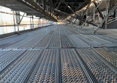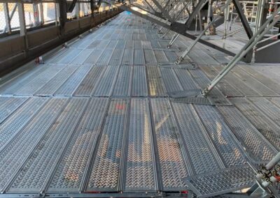 The project was to remove, repair, and re-fit inspection walkways under the bridge in 120m sections at a time. A temporary fully suspended scaffold deck was required to allow main client Millar Callaghan’s steelworkers to work from.