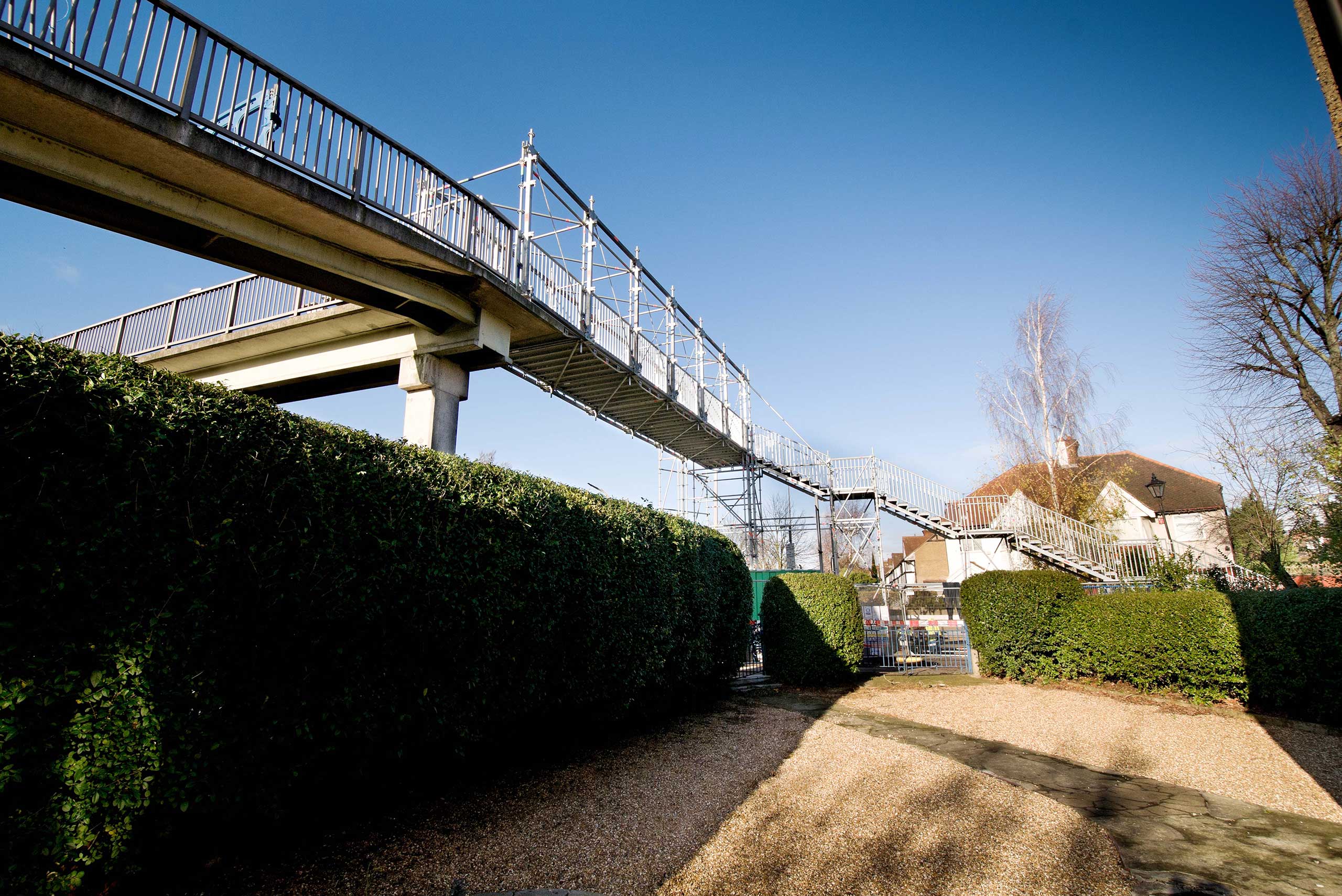 A four-flight Layher Staircase system was built from the adjacent side street, giving access onto the 12.5 metre-long Layher bridging structure which, in turn, connected with the existing footbridge over the Gunnersbury Road section of the A406 in Acton. Layher decking and ‘Buffalo’ board provided the optimum walkway surface.