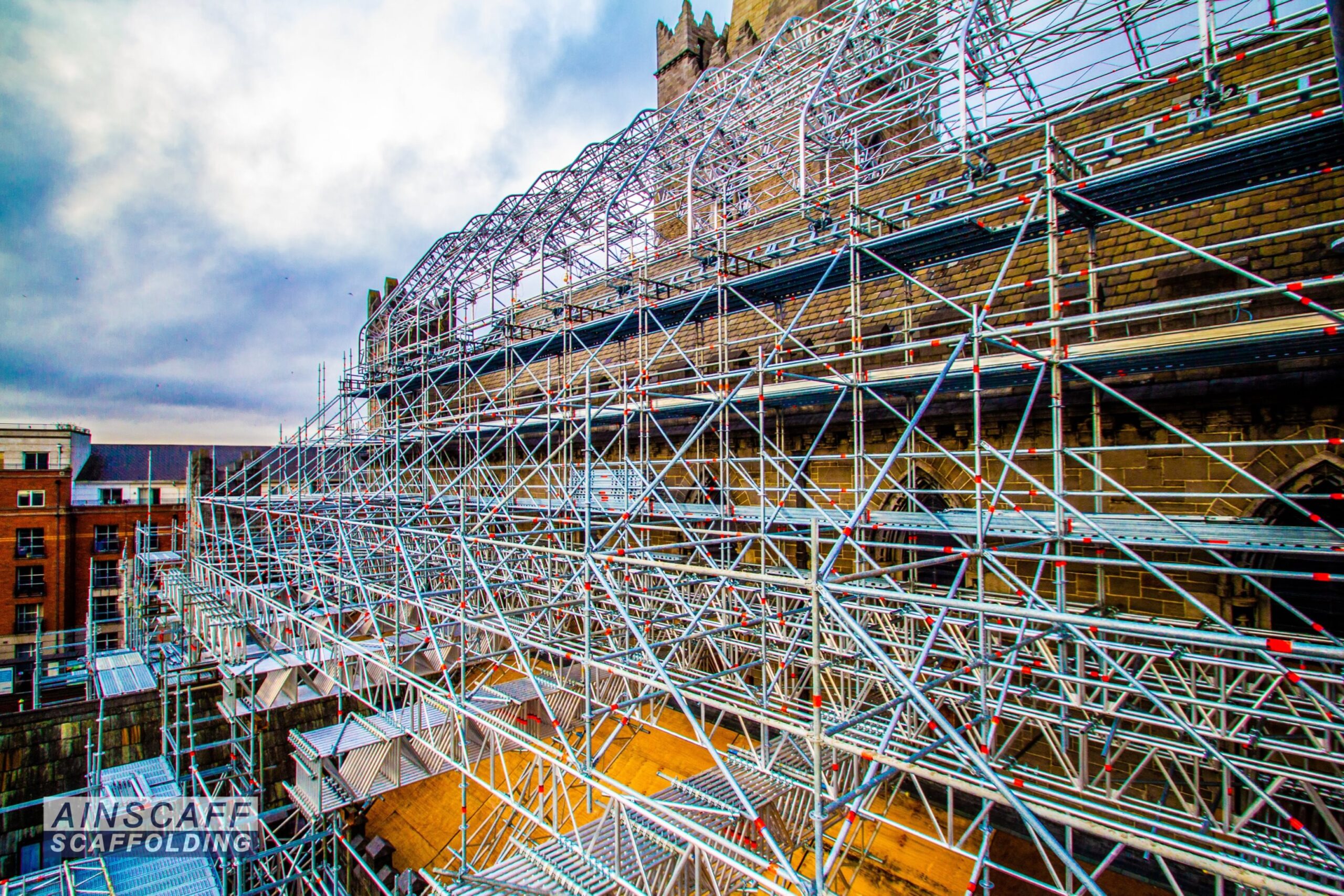 After a year in the planning, the installation above the nave features scaffolds either side of the cathedral to support a series of multiple beam clusters from which further scaffolding then rises to the temporary roof. Simon Ainscough, Director at Ainscaff, highlights the particular issues that have had to be addressed at the site –