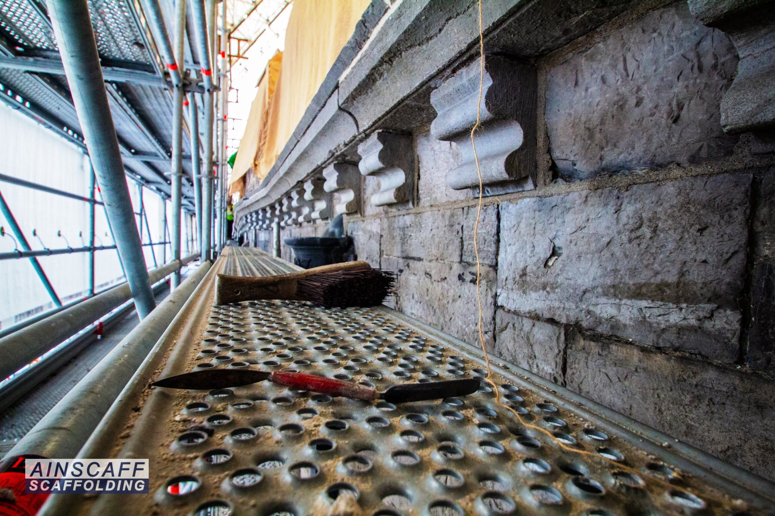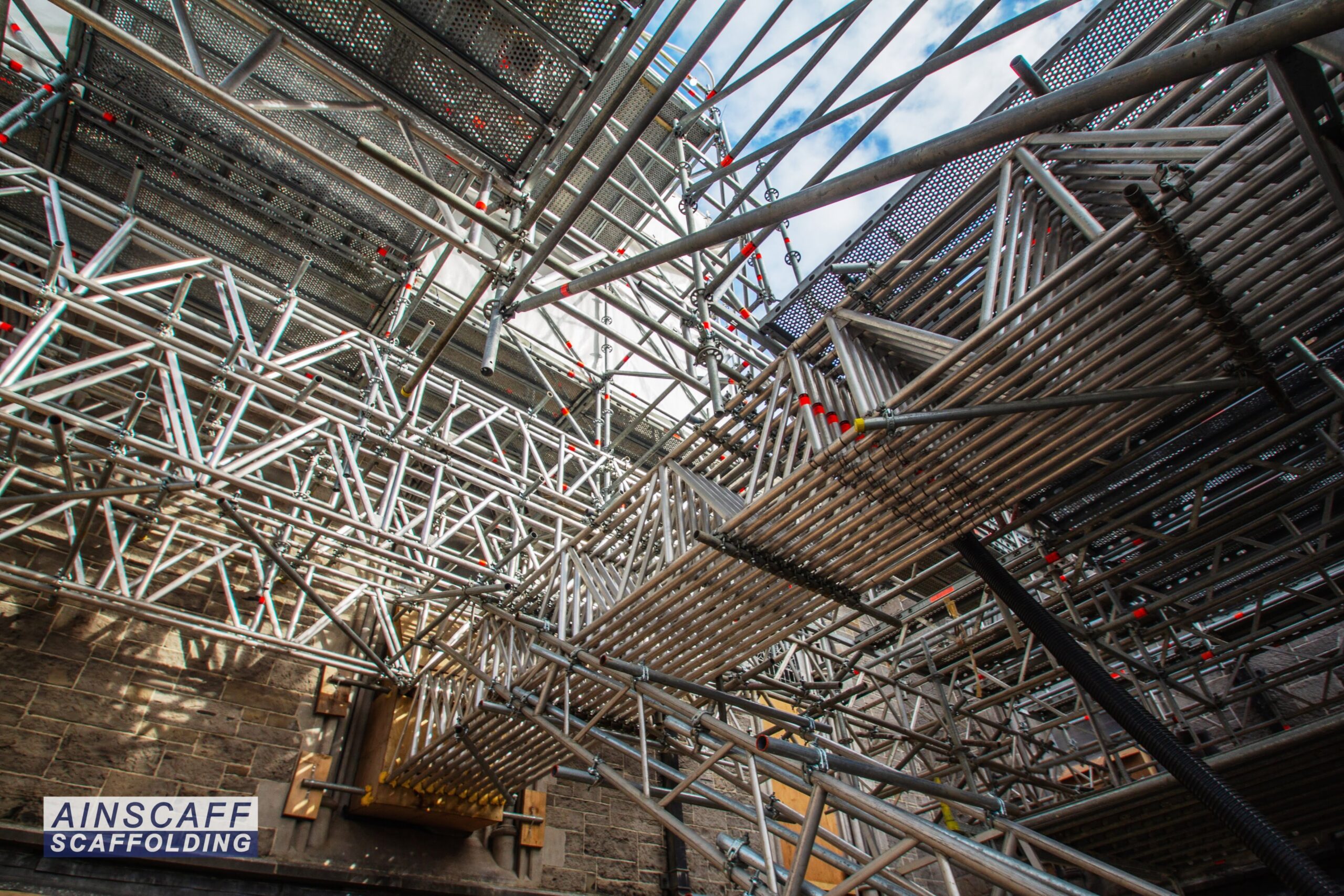 At the heart of the installation Layher’s, Ainscaff’s and Clancy’s design teams have developed a highly innovative scaffold and beam support structure to address the fact that tying-in was not possible.