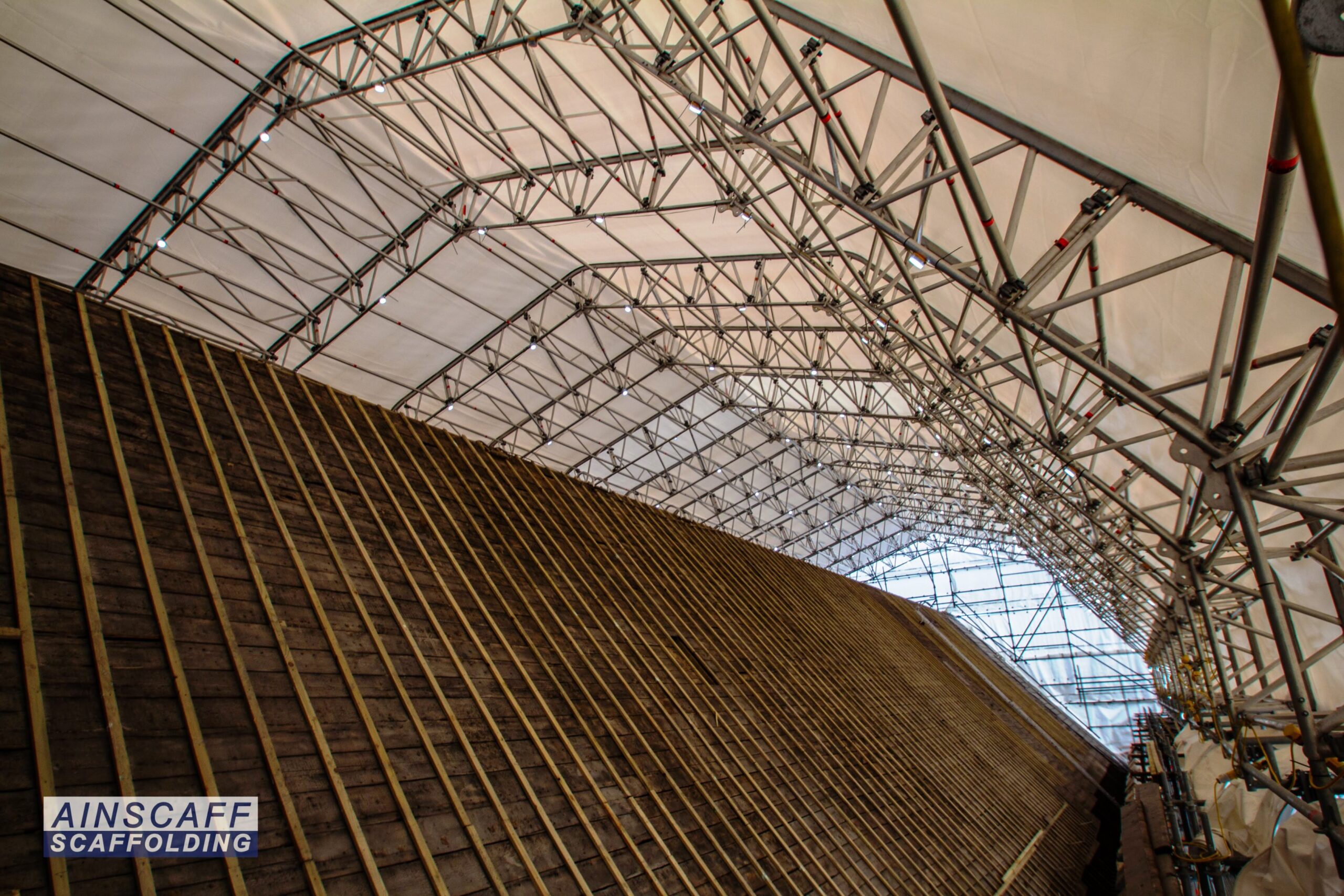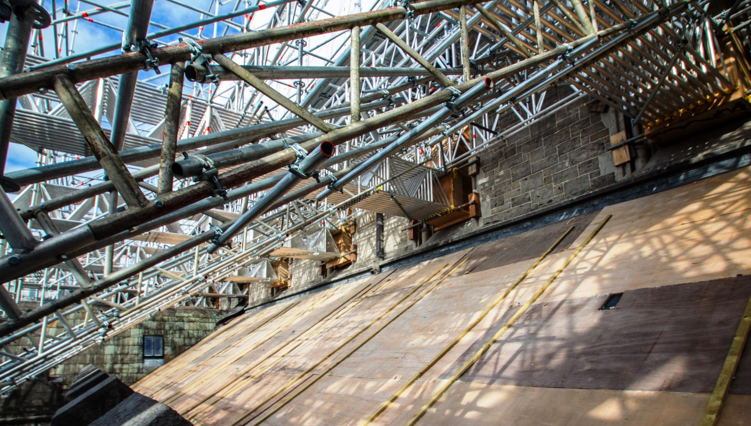 The design effectively bridges – and, therefore, avoids loading onto – lower roof areas which run alongside the nave while also helping to ensure an important door access area remains open. At the same time, the external support scaffold, which extends down to ground level, provides the optimum structure for the installation of a material loading bay and access stair system.