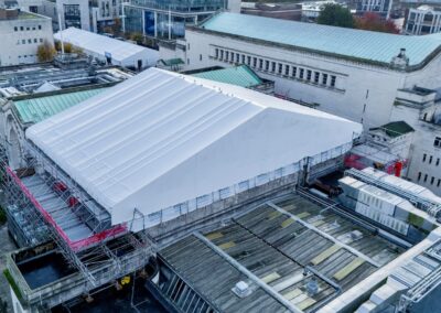 At the heart of this project was Layher’s cutting-edge XL Keder roof encapsulation, which spanned 36 metres – marking one of the largest free-standing roof spans in the UK to date.